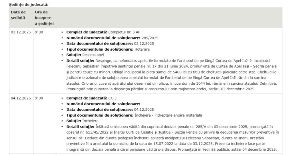 Decizia de condamnare este definitivă, iar Sebastian Felecanu a fost transferat deja în Penitenciarul Iași, unde urmează să execute pedeapsa de 23 de ani. Acesta a încercat să se sustragă executării, ascunzându-se într-o anexă din subsolul blocului, însă a fost depistat rapid după ce dispozitivul electronic de supraveghere a emis o alertă de îndepărtare.