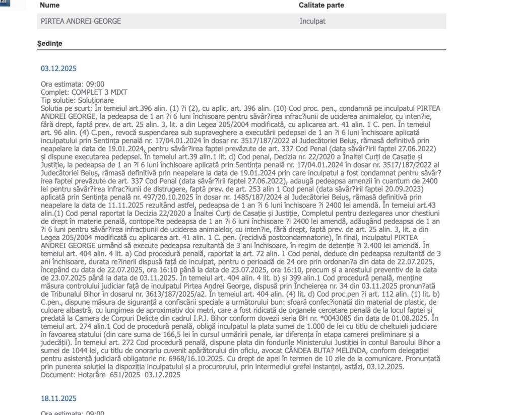 Judecătoria Beiuș a pronunțat, la data de 3 decembrie 2025, Sentința penală nr. 651/2025, prin care l-a condamnat pe Pirtea Andrei George, din localitatea Poienii de Jos, comuna Buntești (județul Bihor), la pedeapsa rezultantă de 3 ani de închisoare în regim de detenție, alături de o amendă penală de 2.400 de lei, pentru mai multe infracțiuni aflate în concurs și în context de recidivă postcondamnatorie.