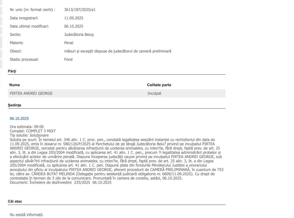Prin încheierea de dezînvestire nr. 235/2025, instanța a constatat legalitatea rechizitoriului emis la 11 septembrie 2025 de Parchetul de pe lângă Judecătoria Beiuș, precum și corectitudinea actelor de urmărire penală efectuate în dosar. În consecință, judecătorul de cameră preliminară a decis trimiterea cauzei în faza de judecată pe fond, pentru infracțiunea de uciderea animalelor, cu intenție, fără drept, faptă prevăzută de art. 25 alin. 3 lit. a din Legea 205/2004, cu aplicarea art. 41 alin. 1 Cod penal.