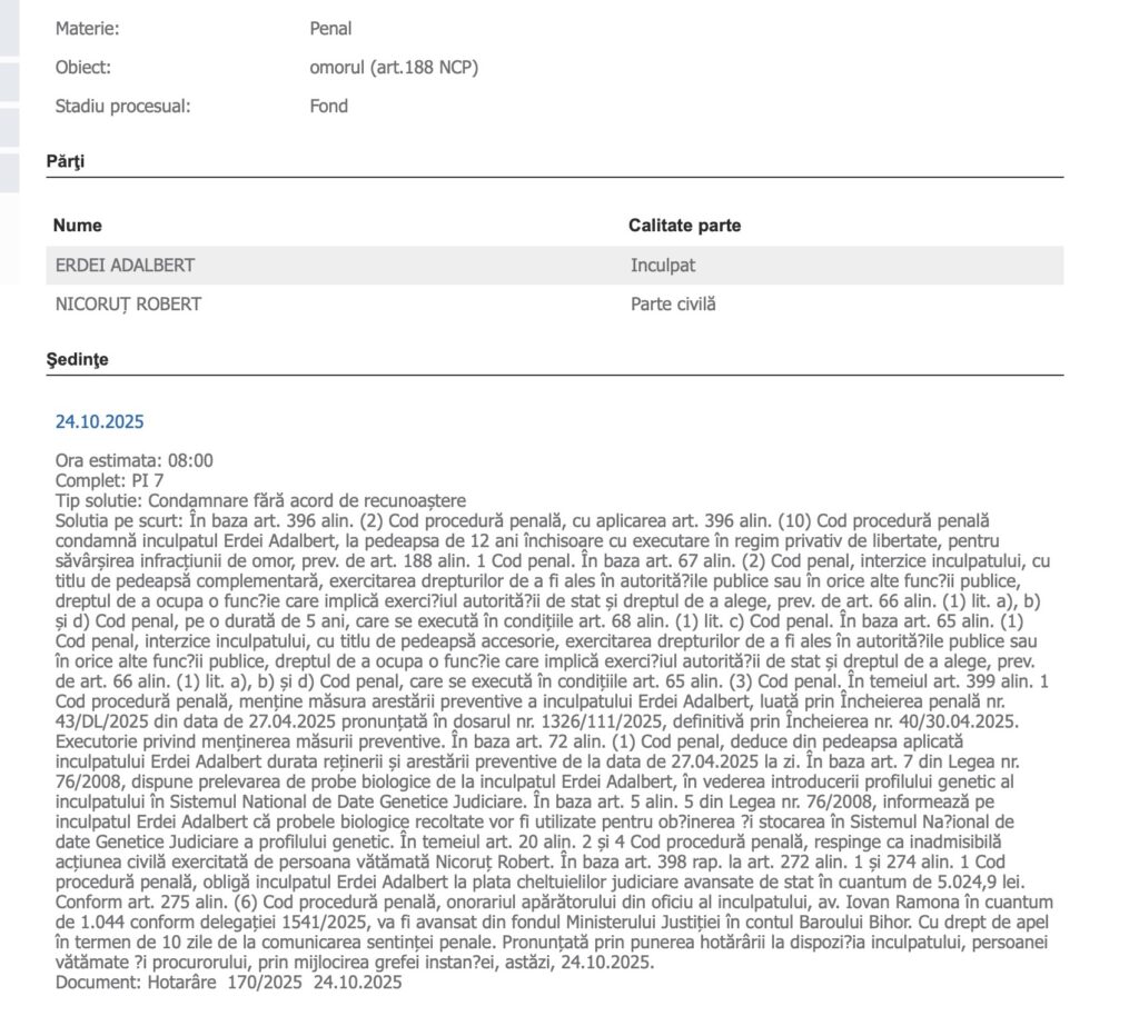 După șase luni de cercetare judecătorească, Tribunalul Bihor – Secția penală, completul PI7, a pronunțat sentința. În baza art. 396 alin. (2) Cod procedură penală, cu aplicarea art. 396 alin. (10), instanța l-a condamnat pe Erdei Adalbert la 12 ani de închisoare cu executare pentru infracțiunea de omor, prevăzută de art. 188 alin. (1) din Codul penal.