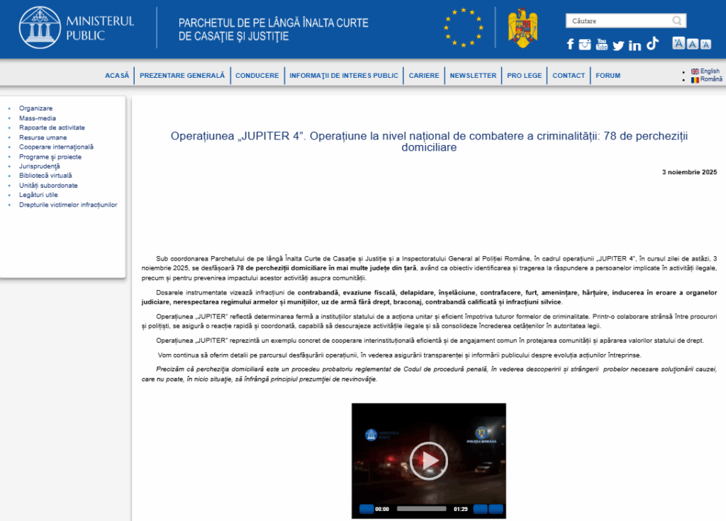 În data de 3 noiembrie 2025, sub coordonarea Parchetului de pe lângă Înalta Curte de Casație și Justiție și a Inspectoratului General al Poliției Române, se desfășoară operațiunea „JUPITER 4”, o amplă acțiune națională vizând destructurarea rețelelor implicate în activități ilegale. Sunt efectuate 78 de percheziții domiciliare în mai multe județe, în dosare ce privesc infracțiuni de contrabandă, evaziune fiscală, delapidare, înșelăciune, contrafacere, furt, amenințare, hărțuire, inducerea în eroare a organelor judiciare, nerespectarea regimului armelor și munițiilor, uz de armă fără drept, braconaj, contrabandă calificată și infracțiuni silvice.. Operațiunea ilustrează cooperarea interinstituțională între procurori și polițiști și angajamentul autorităților pentru combaterea criminalității și consolidarea siguranței publice.