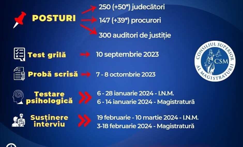 Concursul se organizează pentru ocuparea a 300 locuri de auditori de justifie – INM și pentru ocuparea unui număr de 35 de posturi vacante de personal de specialitate juridică asimilat judecătorilor și procurorilor. Conform comunicatului CSM, posturile sunt împărțite astfel: