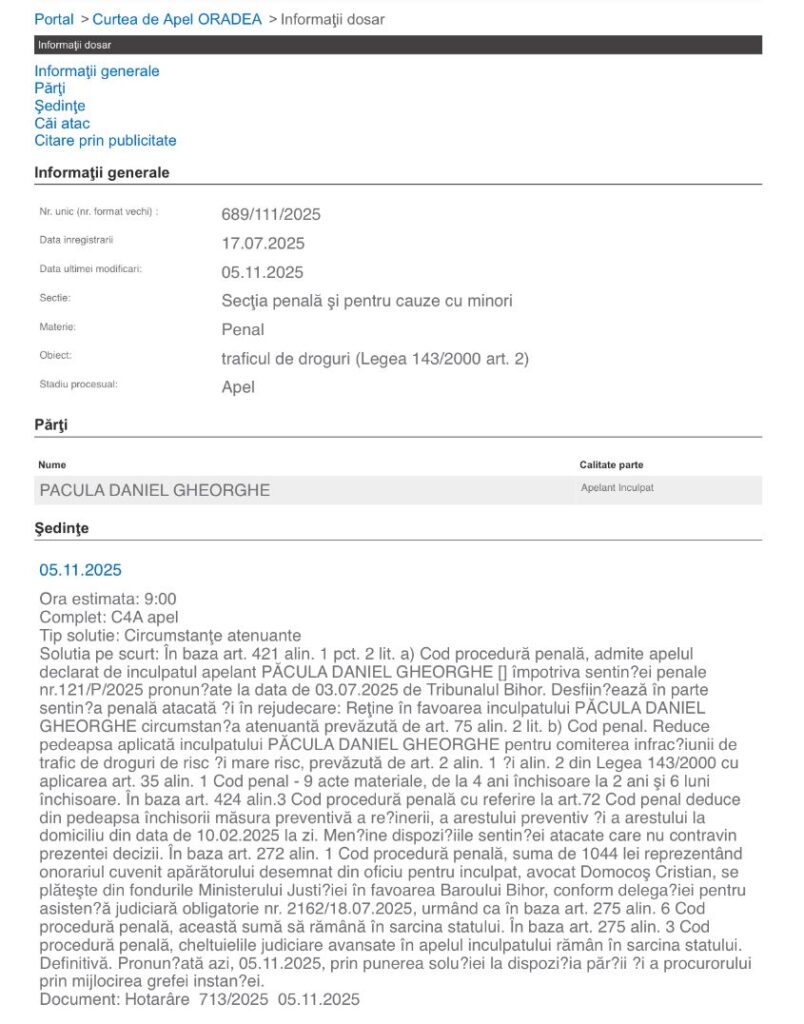 Pe 5 noiembrie 2025, în baza art. 421 alin. 1 pct. 2 lit. a) din Codul de procedură penală, Curtea de Apel a admis apelul formulat de Păcula Daniel Gheorghe împotriva sentinței penale nr. 121/P/2025 pronunțate de Tribunalul Bihor la 3 iulie 2025. Instanța a desființat în parte sentința penală atacată și, în rejudecare, a reținut în favoarea inculpatului circumstanța atenuantă prevăzută de art. 75 alin. 2 lit. b) Cod penal.