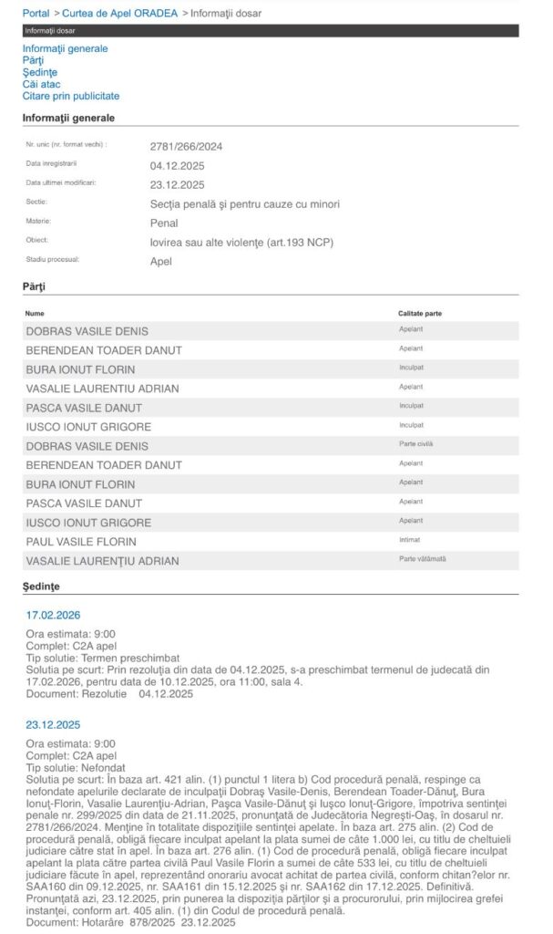 Prin hotărârea pronunțată la 23 decembrie 2025, Curtea de Apel Oradea a respins toate apelurile ca nefondate și a menținut integral sentința Judecătoriei Negrești-Oaș. Decizia este definitivă și nu mai poate fi atacată.
