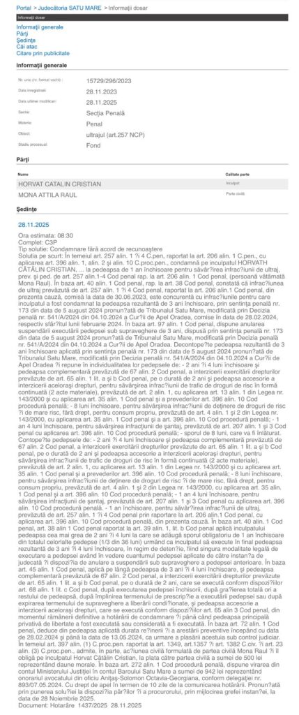 Sentința a fost pronunțată la 28 noiembrie 2025 de Judecătoria Satu Mare, în dosarul nr. 1437/2025, conform hotărârii judecătorești .