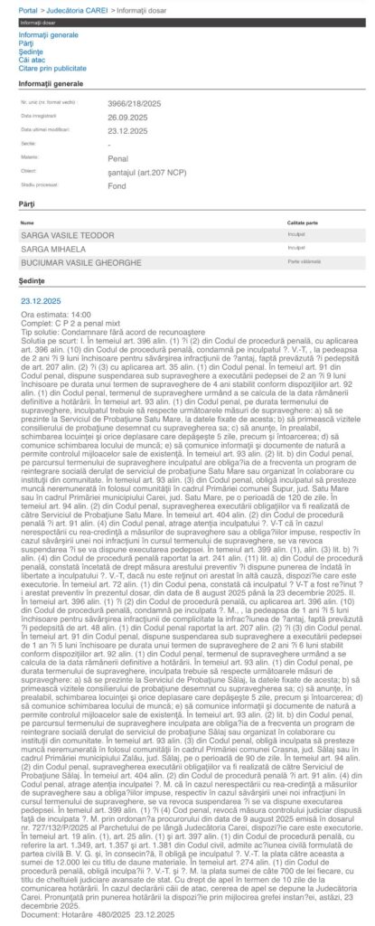 Un caz grav de șantaj bazat pe amenințări cu un dosar penal fals a fost soluționat de Judecătoria Carei, care a pronunțat, la data de 23 decembrie 2025, condamnări cu închisoare cu suspendare pentru doi soți din județul Satu Mare. Instanța a stabilit că victima a fost supusă unei presiuni psihice intense și continue, fiind determinată să plătească sume importante de bani din teama pierderii libertății.