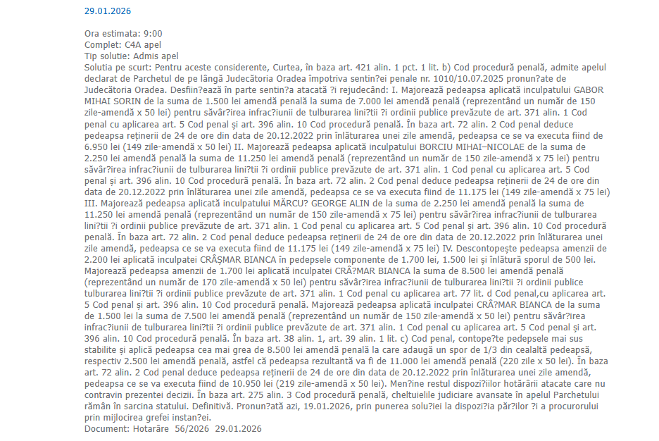 Gabor Mihai Sorin, cunoscut ca „Grecu’” – amenda penală a fost majorată de la 1.500 lei la 7.000 lei, urmând să execute 6.950 lei după deducerea unei zile-amendă pentru reținerea de 24 de ore.