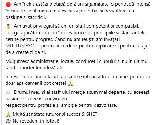 ”Am închis astăzi o etapă de 2 ani și jumătate, o perioadă intensă în care focusul meu a fost exclusiv pe fotbal si dezvoltare, cu pasiune si sacrificii. Am avut privilegiul să am un staff competent și compatibil, colegi și jucători care au înțeles procesul, principiile și standardele cerute pentru progres. Cand nu am reușit, am învățat!
