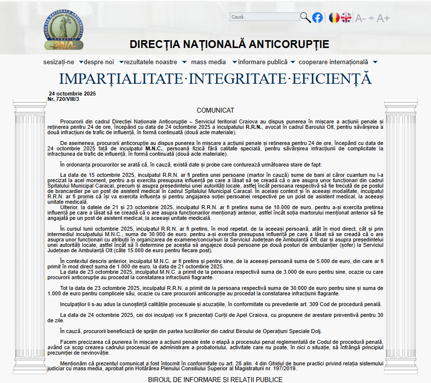 „Procurorii din cadrul Direcției Naționale Anticorupție – Serviciul teritorial Craiova au dispus punerea în mișcare a acțiunii penale și reținerea pentru 24 de ore, începând cu data de 24 octombrie 2025 a inculpatului R.R.N., avocat în cadrul Baroului Olt, pentru săvârșirea a două infracțiuni de trafic de influență, în formă continuată (două acte materiale).