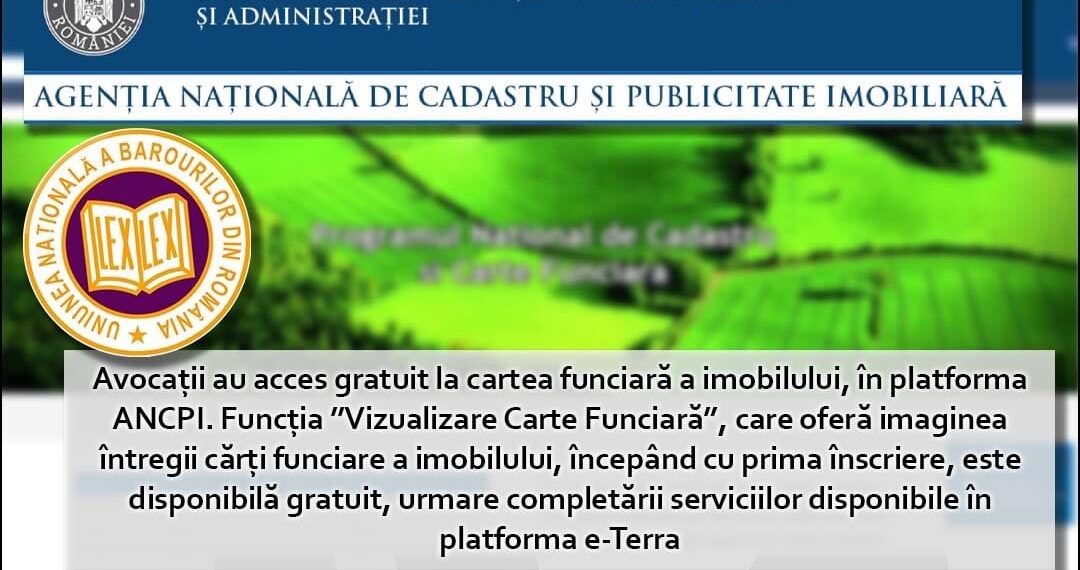 Serviciile din platforma e-Terra au fost completate cu noi produse, iar astfel avocații au acces gratuit la cartea funciară a imobilului, în platformă fiind disponibilă gratuit funcția ’’Vizualizare Carte Funciară, care oferă imaginea întregii cărți funciare a imobilului, începând cu prima înscriere, cu mențiunea ’’neutilizabil în circuitul civil’’.