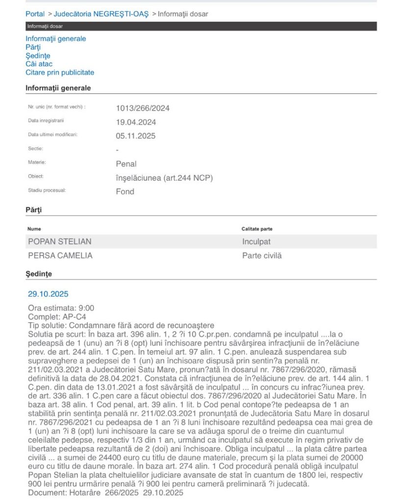 La data comiterii noii fapte, el se afla deja sub o pedeapsă de 1 an cu suspendare, dispusă printr-o sentință a Judecătoriei Satu Mare din 2021.