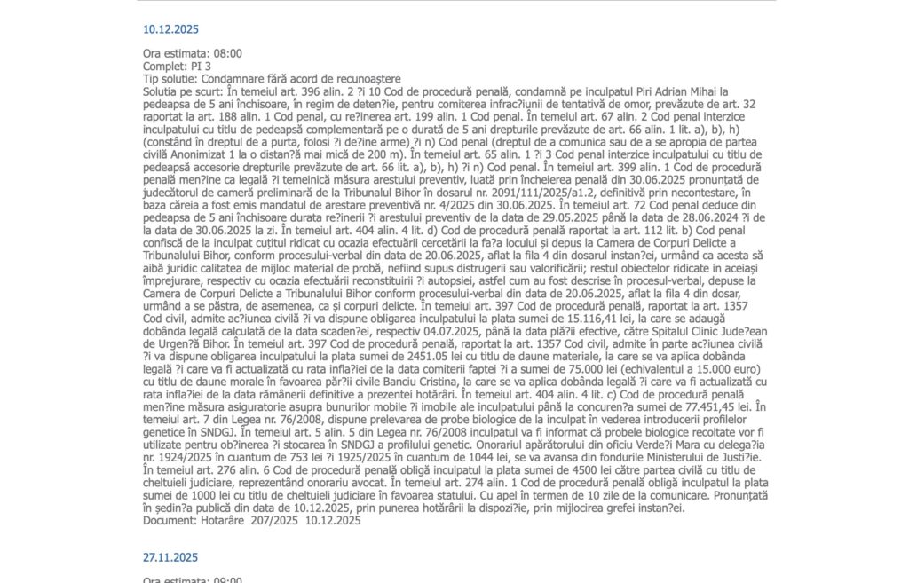 Tribunalul Bihor l-a condamnat miercuri, 10 decembrie 2025, la 5 ani de închisoare pe Adrian Mihai Piri, în vârstă de 34 de ani, din Suplacu de Barcău, găsit vinovat de tentativă de omor asupra iubitei sale. Instanța a stabilit executarea pedepsei în regim de detenție și a menținut arestul preventiv al inculpatului. Totodată, bărbatului i-au fost interzise mai multe drepturi, inclusiv apropierea de victimă la o distanță mai mică de 200 de metri.