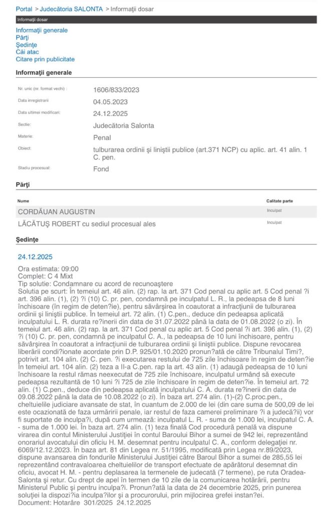 Instanța l-a condamnat pe Lăcătuș Robert la 8 luni de închisoare cu executare, pentru infracțiunea de tulburare a ordinii și liniștii publice, săvârșită în coautorat.