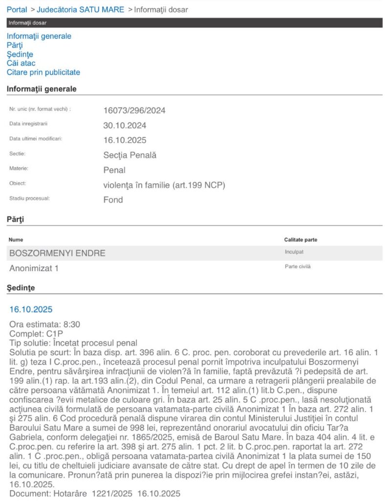 „În baza disp. art. 396 alin. 6 C. proc. pen. coroborat cu prevederile art. 16 alin. 1 lit. g) teza I C.proc.pen., încetează procesul penal pornit împotriva inculpatului Boszormenyi Endre, pentru săvârşirea infracţiunii de violență în familie, faptă prevăzută și pedepsită de art. 199 alin.(1) raportat la art. 193 alin.(2) din Codul Penal, ca urmare a retragerii plângerii prealabile de către persoana vătămată.”
