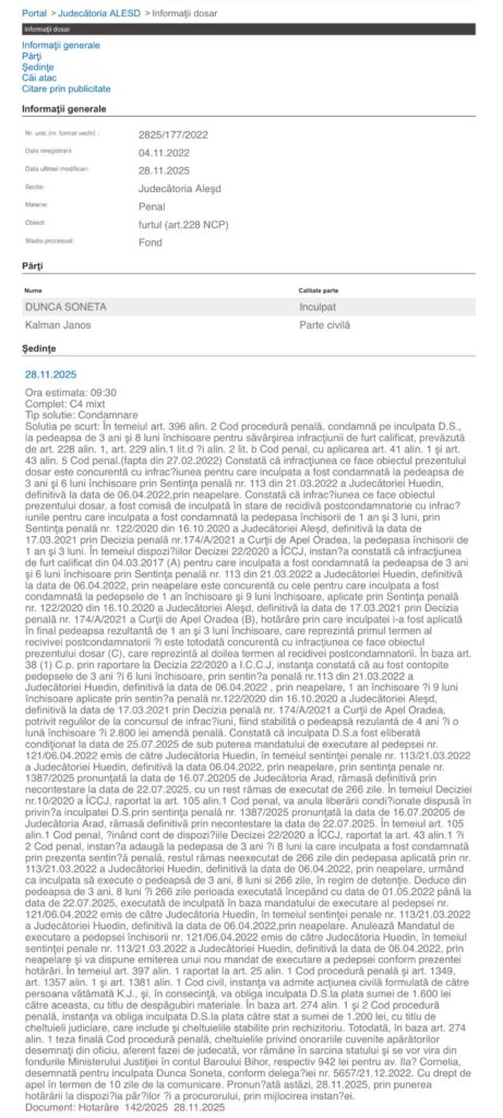 Dunca Soneta avea numeroase condamnări anterioare pentru infracțiuni contra patrimoniului. La momentul soluționării cauzei: