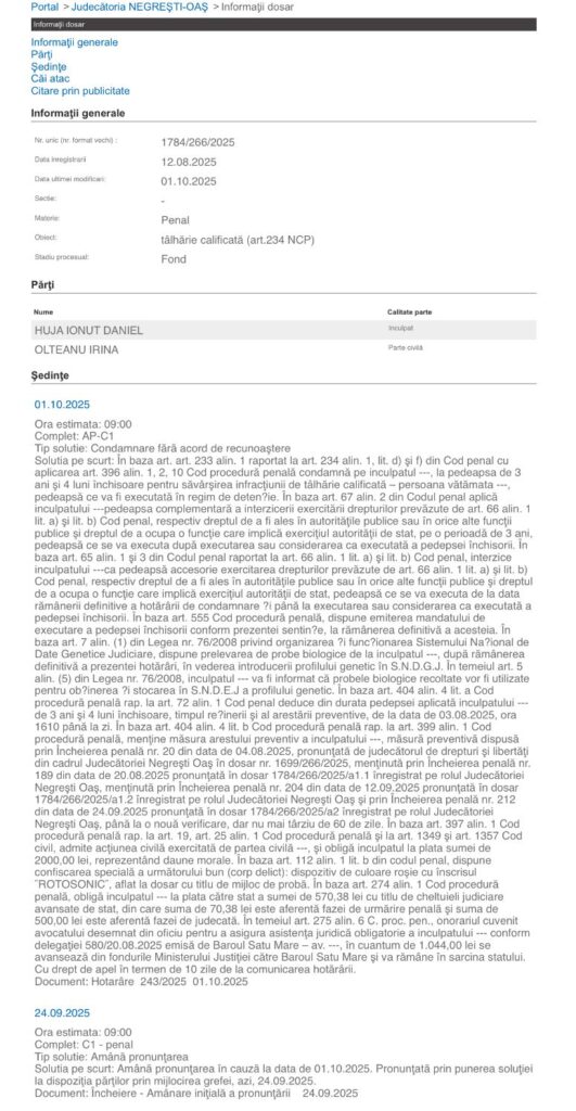 Judecătoria Negrești-Oaș a condamnat pe Huja Ionuț Daniel la 3 ani și 4 luni de închisoare cu executare pentru săvârșirea infracțiunii de tâlhărie calificată. Fapta a avut loc în noaptea de 2 august 2025, când acesta a intrat în locuința unei femei de 54 de ani și a agresat-o fizic pentru a-i fura telefonul mobil.