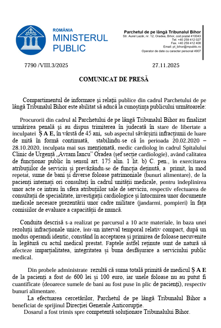 În cadrul cercetărilor, Parchetul de pe lângă Tribunalul Bihor a beneficiat de sprijinul Direcției Generale Anticorupție, care a desfășurat activități procedurale specifice pentru documentarea faptelor.