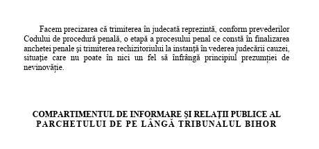 Postăm comunicatul de presă al Parchetului de pe lângă Tribunalul Bihor.
