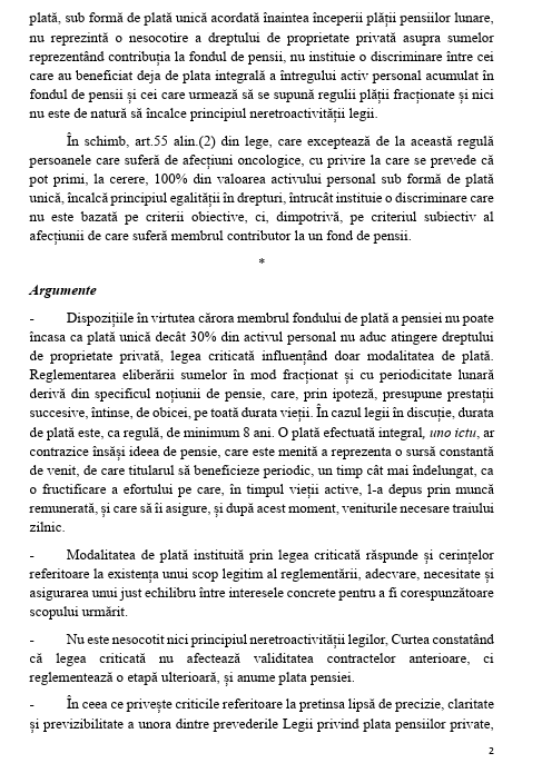 Curtea Constituțională a constatat că stabilirea, ca regulă, a plății către membrul unui fond de plată a pensiilor private/facultative a unui procent de maximum 30% din valoarea activului său personal transferat către fondul de plată, sub formă de plată unică acordată înaintea începerii plății pensiilor lunare, nu reprezintă o nesocotire a dreptului de proprietate privată asupra sumelor reprezentând contribuția la fondul de pensii, nu instituie o discriminare între cei care au beneficiat deja de plata integrală a întregului activ personal acumulat în fondul de pensii și cei care urmează să se supună regulii plății fracționate și nici nu este de natură să încalce principiul neretroactivității legii.