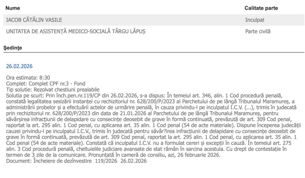 Un dosar de amploare privind presupuse fapte de delapidare comise pe parcursul a aproape cinci ani a intrat oficial în faza de judecată. În data de 26 februarie 2026, judecătorul de cameră preliminară din cadrul Tribunalul Maramureș a constatat legalitatea sesizării instanței, a administrării probelor și a actelor de urmărire penală în dosarul nr. 628/200/P/2023 al Parchetului de pe lângă Tribunalul Maramureș și a dispus începerea judecății pe fond.