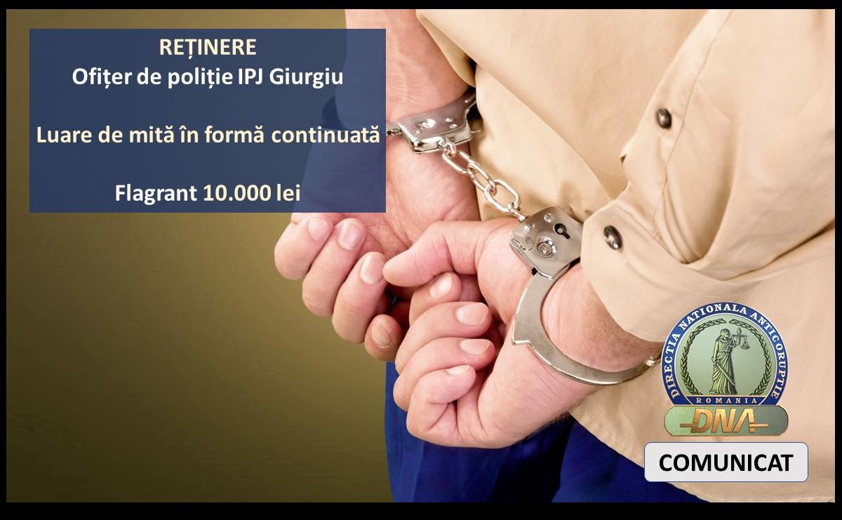Procurorii Direcției Naționale Anticorupție – Secția de combatere a infracțiunilor de corupție au dispus punerea în mișcare a acțiunii penale și reținerea pentru 24 de ore a comisarului-șef Adrian Ciulei, ofițer în cadrul Serviciului de Investigare a Criminalității Economice al IPJ Giurgiu, pentru săvârșirea infracțiunii de luare de mită în formă continuată (5 acte materiale).
