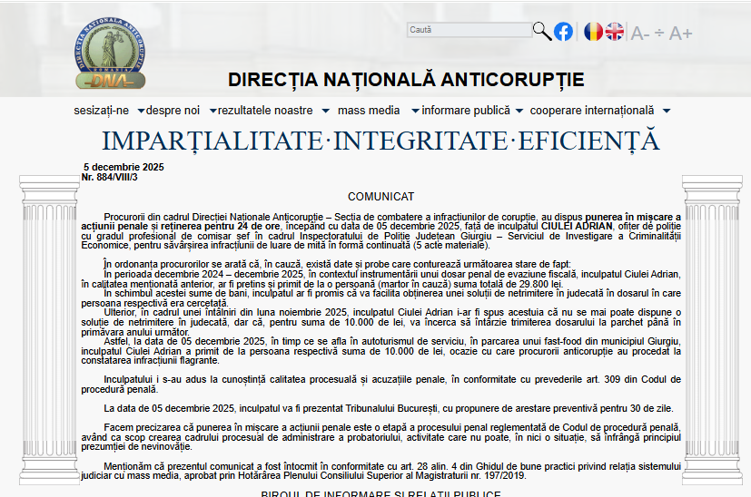 „Procurorii din cadrul Direcției Naționale Anticorupție – Secția de combatere a infracțiunilor de corupție, au dispus punerea în mișcare a acțiunii penale și reținerea pentru 24 de ore, începând cu data de 05 decembrie 2025, față de inculpatul CIULEI ADRIAN, ofițer de poliție cu gradul profesional de comisar șef în cadrul Inspectoratului de Poliție Județean Giurgiu – Serviciul de Investigare a Criminalității Economice, pentru săvârșirea infracțiunii de luare de mită în formă continuată (5 acte materiale).
