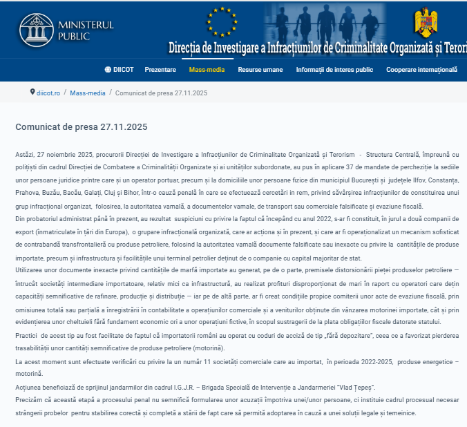 Procurorii DIICOT – Structura Centrală și polițiștii de la Crimă Organizată au făcut azi, 27 noiembrie 2025, 37 de percheziții în București și în județele Ilfov, Constanța, Prahova, Buzău, Bacău, Galați, Cluj și Bihor, inclusiv la un operator portuar și la 11 firme care au importat motorină între 2022–2025. Ancheta vizează un grup infracțional organizat care ar fi folosit documente vamale și comerciale falsificate pentru contrabandă cu produse petroliere și evaziune fiscală, folosind inclusiv infrastructura unui terminal petrolier al unei companii cu capital majoritar de stat. Schema ar fi permis obținerea de profituri uriașe de către intermediari și sustragerea de la plata taxelor datorate statului, prin neînregistrarea veniturilor și operațiuni fictive. DIICOT subliniază că, în acest moment, se fac cercetări in rem, fără formularea de acuzații concrete împotriva unor persoane.