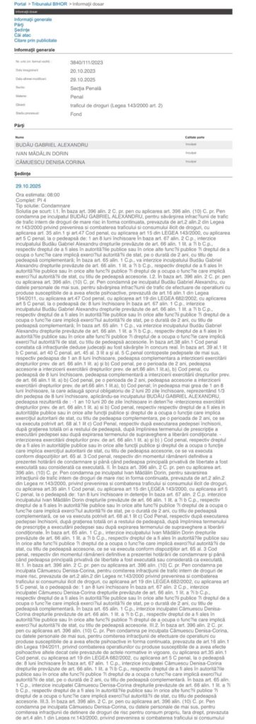 Trei persoane – Budău Gabriel Alexandru, Ivan Mădălin Dorin și Cămuescu Denisa-Corina – au fost condamnate la pedepse cu închisoarea pentru implicarea în activități de comercializare și distribuție de droguri și produse cu efect psihoactiv, potrivit Legii nr. 143/2000 și Legii nr. 194/2011.