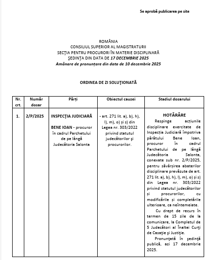 Secția pentru procurori în materie disciplinară din cadrul Consiliului Superior al Magistraturii a dispus, în ședință publică din data de 17 decembrie 2025, respingerea tuturor acțiunilor disciplinare exercitate de Inspecția Judiciară împotriva procurorului Ioan Bene, din cadrul Parchetului de pe lângă Judecătoria Salonta.