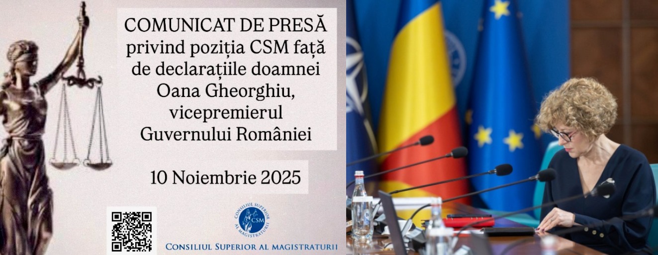 Consiliul Superior al Magistraturii condamnă ferm declarațiile vicepremierului Oana Gheorghiu formulate în cadrul unui interviu televizat, prin care independența justiției și statutul magistraților au fost încălcate într-un mod iresponsabil și populist.