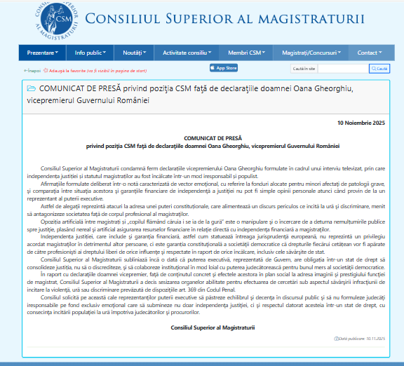 Consiliul Superior al Magistraturii anunță că a sesizat Parchetul de pe lângă Înalta Curte de Casație și Justiție cu privire la declarațiile publice formulate de vicepremierul României, doamna Oana Gheorghiu, într-un interviu televizat recent. În opinia CSM, afirmațiile acesteia depășesc limita criticii politice și intră în sfera unei posibile fapte penale, întrucât pot constitui incitare la violență, ură sau discriminare împotriva unei categorii profesionale – magistrații.