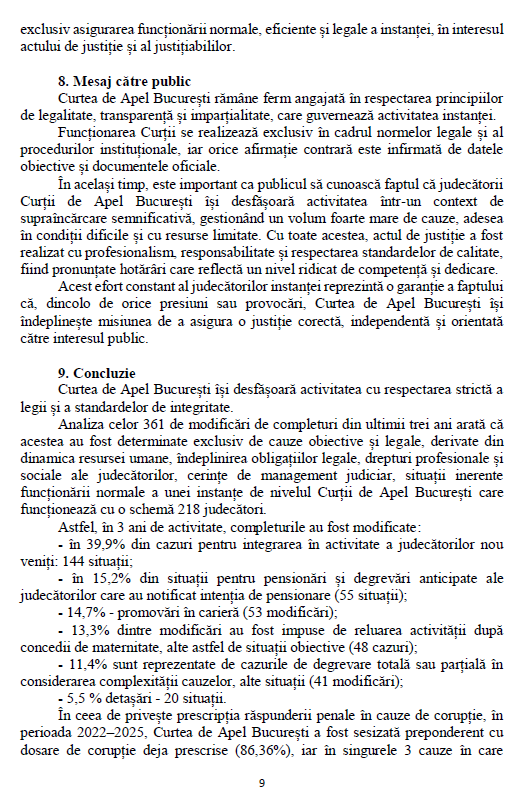 În același timp, este important ca publicul să cunoască faptul că judecătorii Curții de Apel București își desfășoară activitatea într-un context de supraîncărcare semnificativă, gestionând un volum foarte mare de cauze, adesea în condiții dificile și cu resurse limitate. Cu toate acestea, actul de justiție a fost realizat cu profesionalism, responsabilitate și respectarea standardelor de calitate, fiind pronunțate hotărâri care reflectă un nivel ridicat de competență și dedicare.