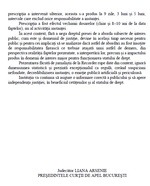 Curtea de Apel București respectă libertatea presei și rolul esențial al jurnalismului într-o societate democratică, dar apreciază că, atunci când sunt vizate instituții fundamentale ale statului, este necesară o informare riguroasă, completă și lipsită de interpretări care pot induce în eroare opinia publică.