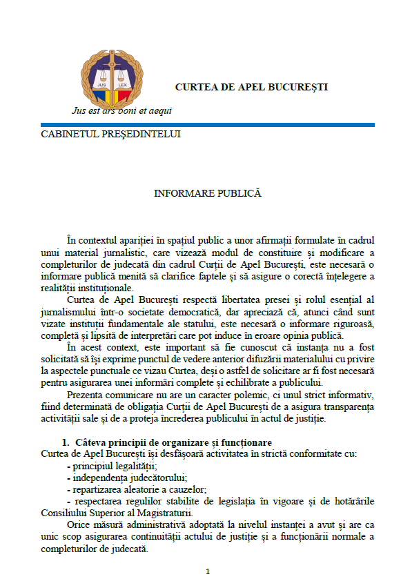 Prezenta comunicare nu are un caracter polemic, ci unul strict informativ, fiind determinată de obligația Curții de Apel București de a asigura transparența activității sale și de a proteja încrederea publicului în actul de justiție.
