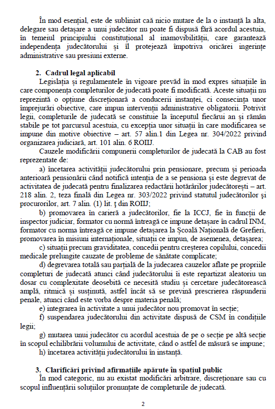 CAB subliniază că nicio mutare nu se poate face fără acordul judecătorului și că activitatea de conducere nu a fost folosită pentru influențarea soluțiilor. Toate modificările sunt documentate, verificabile și conforme cu legea și regulamentul instanțelor.