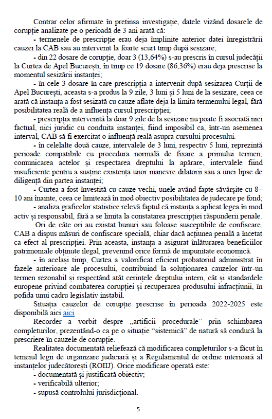 Modificarea completurilor de judecată la Curtea de Apel București a fost și este un proces legal, transparent și verificabil. Corelarea acestei realități administrative cu soluții impuse de prescripție în dosare deja compromise procedural reprezintă o interpretare vădit tendențioasă care ignoră cadrul legal și realitatea obiectivă a funcționării justiției.