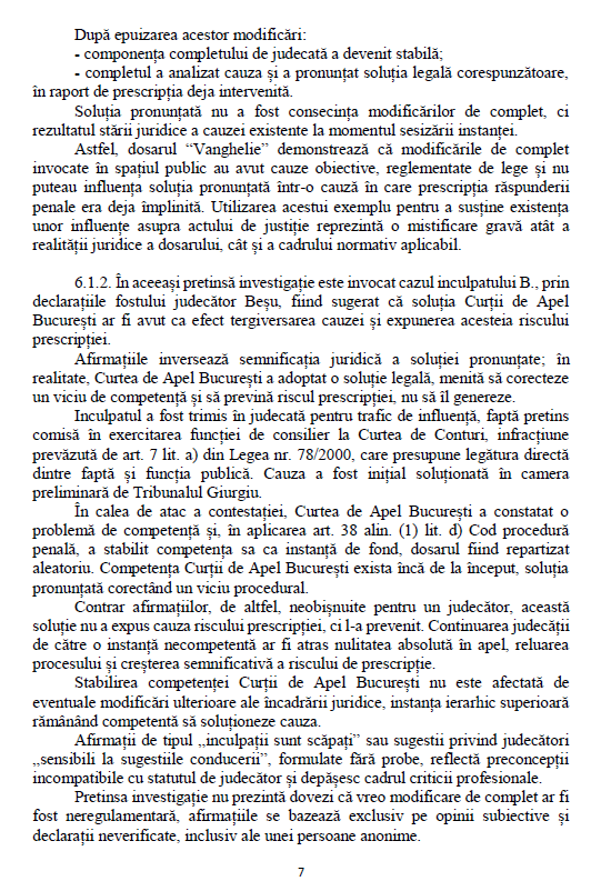 Astfel, dosarul “Vanghelie” demonstrează că modificările de complet invocate în spațiul public au avut cauze obiective, reglementate de lege și nu puteau influența soluția pronunțată într-o cauză în care prescripția răspunderii penale era deja împlinită. Utilizarea acestui exemplu pentru a susține existența unor influențe asupra actului de justiție reprezintă o mistificare gravă atât a realității juridice a dosarului, cât și a cadrului normativ aplicabil.