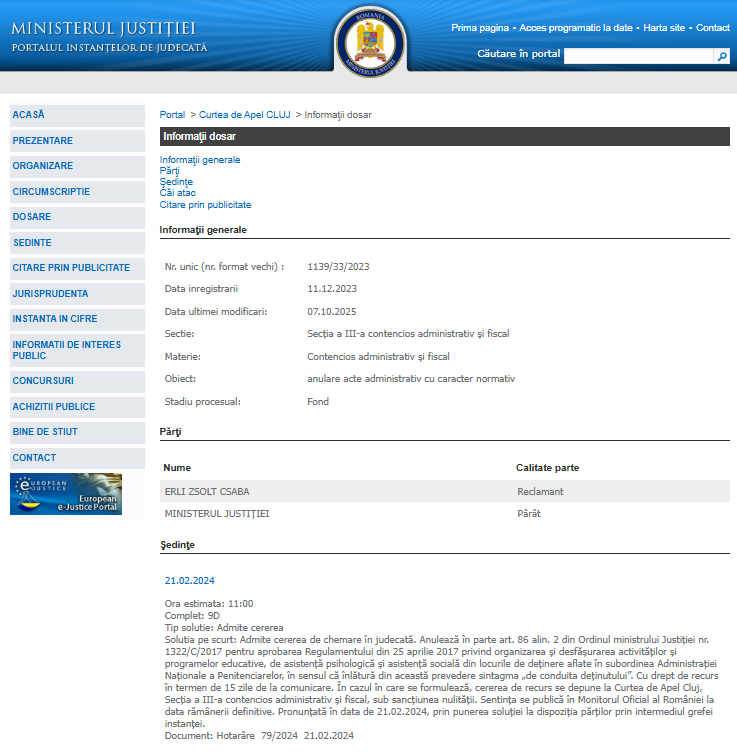 Prin Sentința civilă nr. 79/2024, pronunțată în dosarul nr. 1139/33/2023, instanța a dispus anularea parțială a art. 86 alin. (2) din Ordinul ministrului justiției nr. 1322/C/2017, stabilind că prevederea „aprobarea este condiționată de conduita deținutului” este nelegală și trebuie înlăturată. Hotărârea, rămasă definitivă, a fost publicată în Monitorul Oficial, Partea I, nr. 990/28 octombrie 2025, devenind general obligatorie.