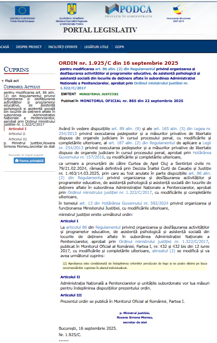 Publicarea în Monitorul Oficial face ca această decizie să devină obligatorie pentru toate penitenciarele din țară, reafirmând dreptul la educație ca instrument esențial pentru reintegrarea socială a persoanelor aflate în detenție.