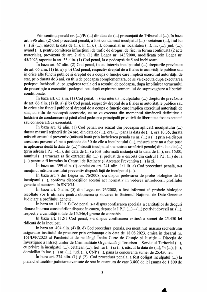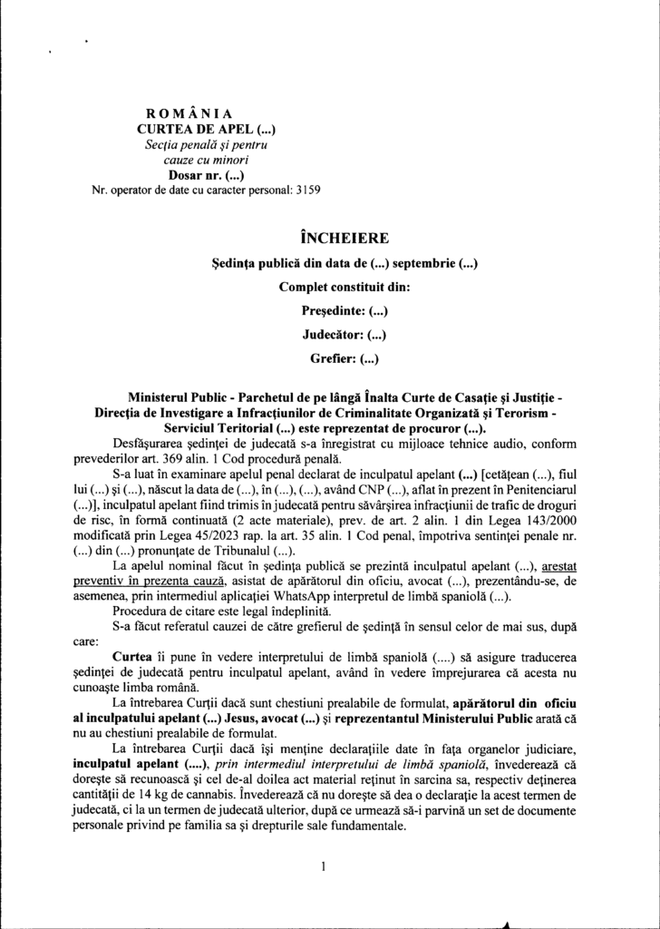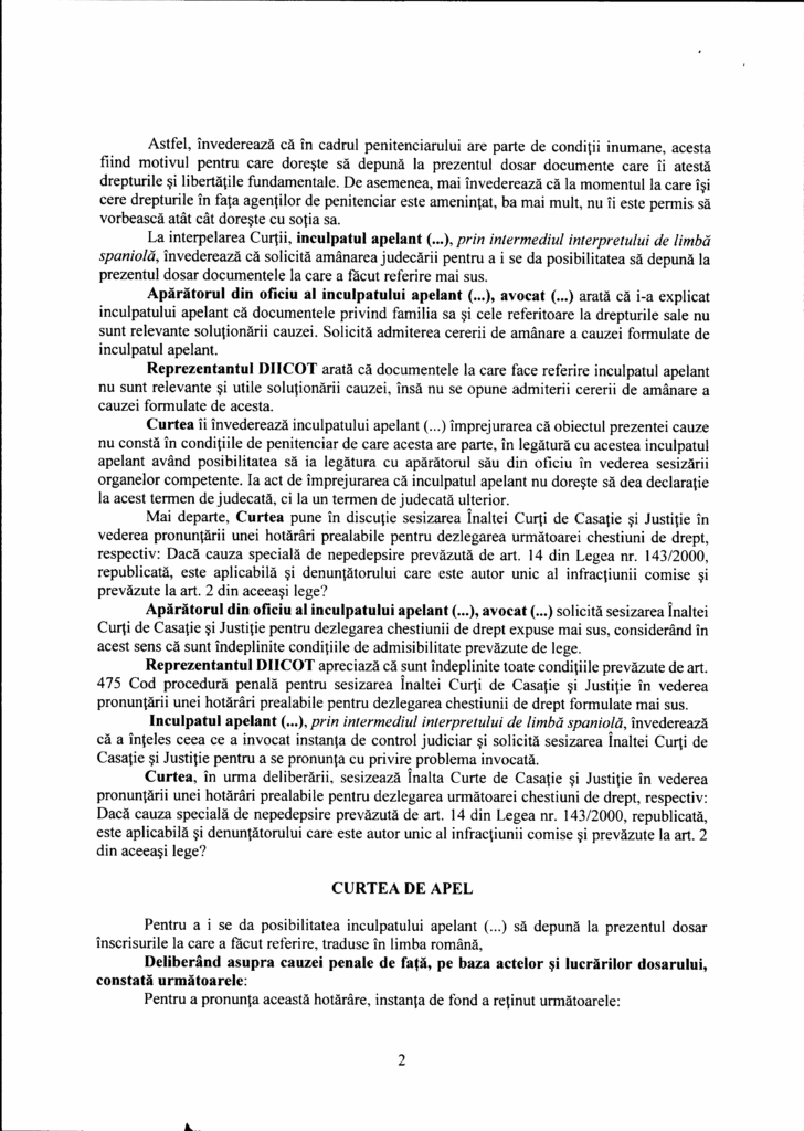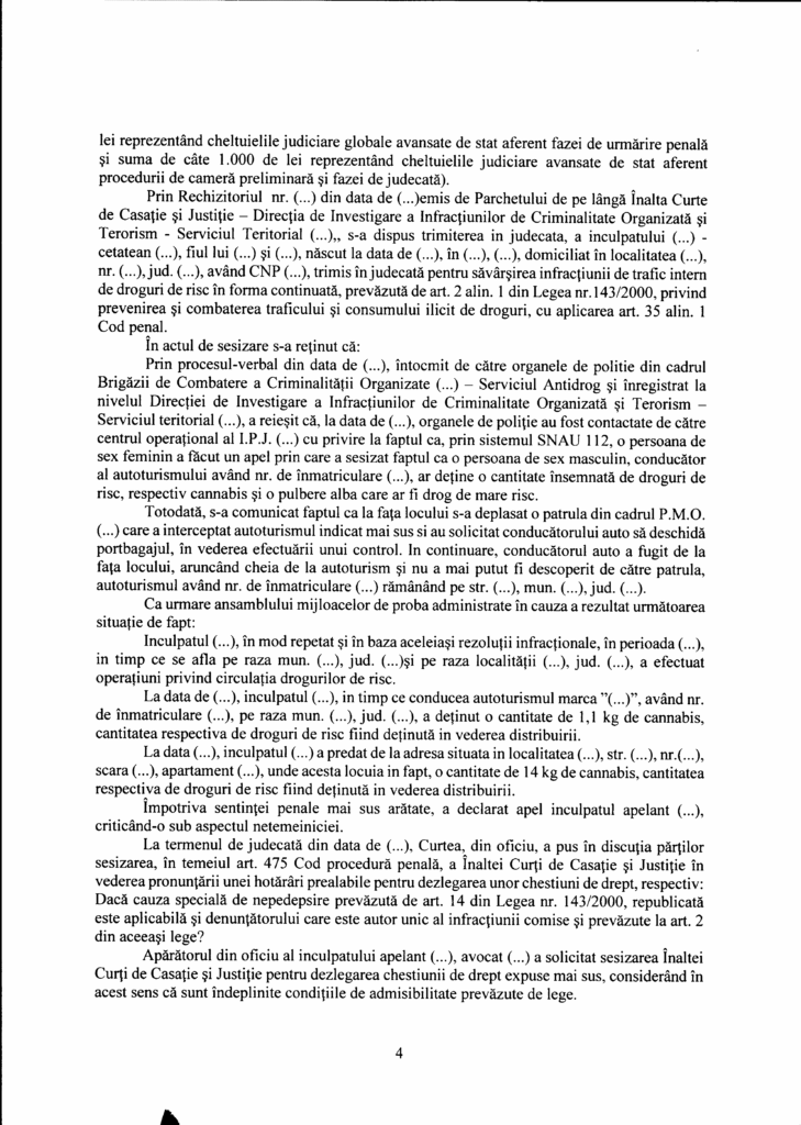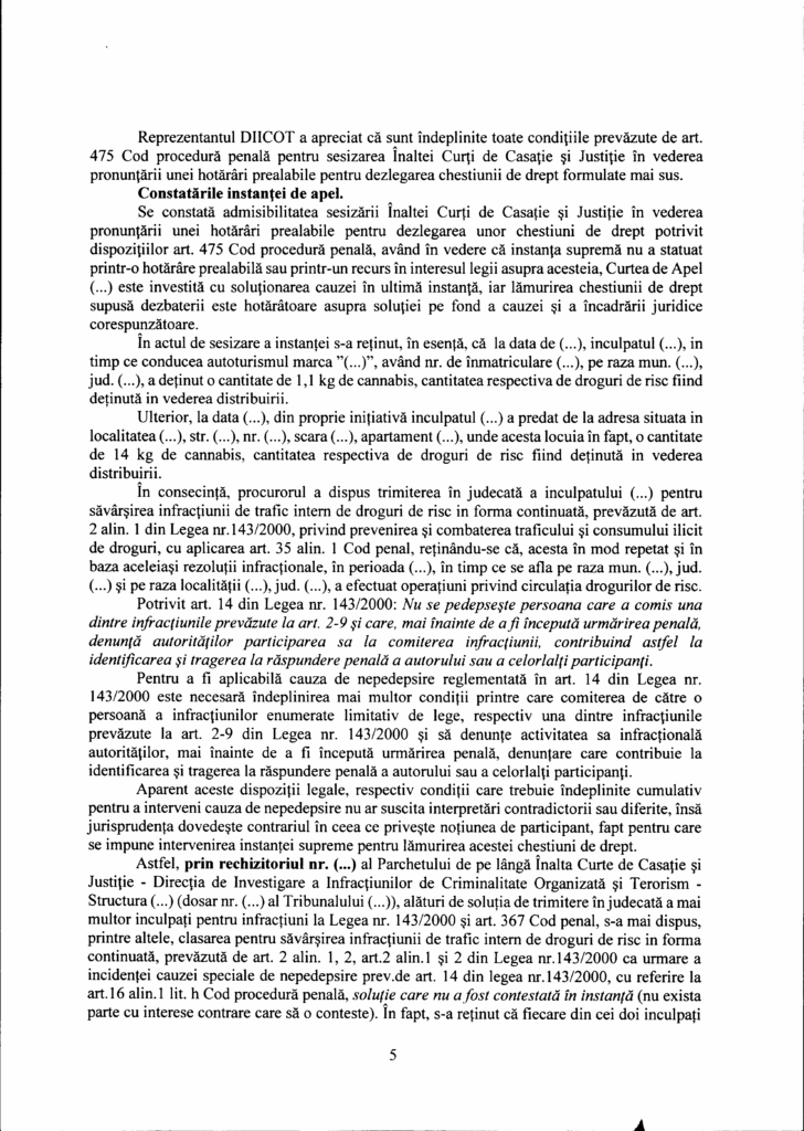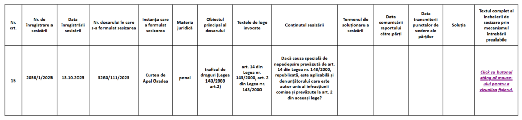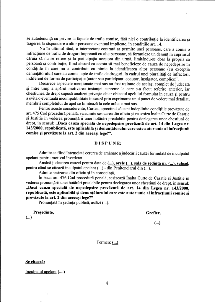Curtea de Apel Oradea a dispus, printr-o încheiere pronunțată în ședință publică, sesizarea Înaltei Curți de Casație și Justiție pentru pronunțarea unei hotărâri prealabile în temeiul art. 475 Cod procedură penală, privind interpretarea art. 14 din Legea nr. 143/2000. Instanța supremă este chemată să stabilească dacă beneficiul cauzei speciale de nepedepsire prevăzute de art. 14 se aplică și denunțătorului care este, totodată, autor unic al infracțiunii de trafic de droguri.