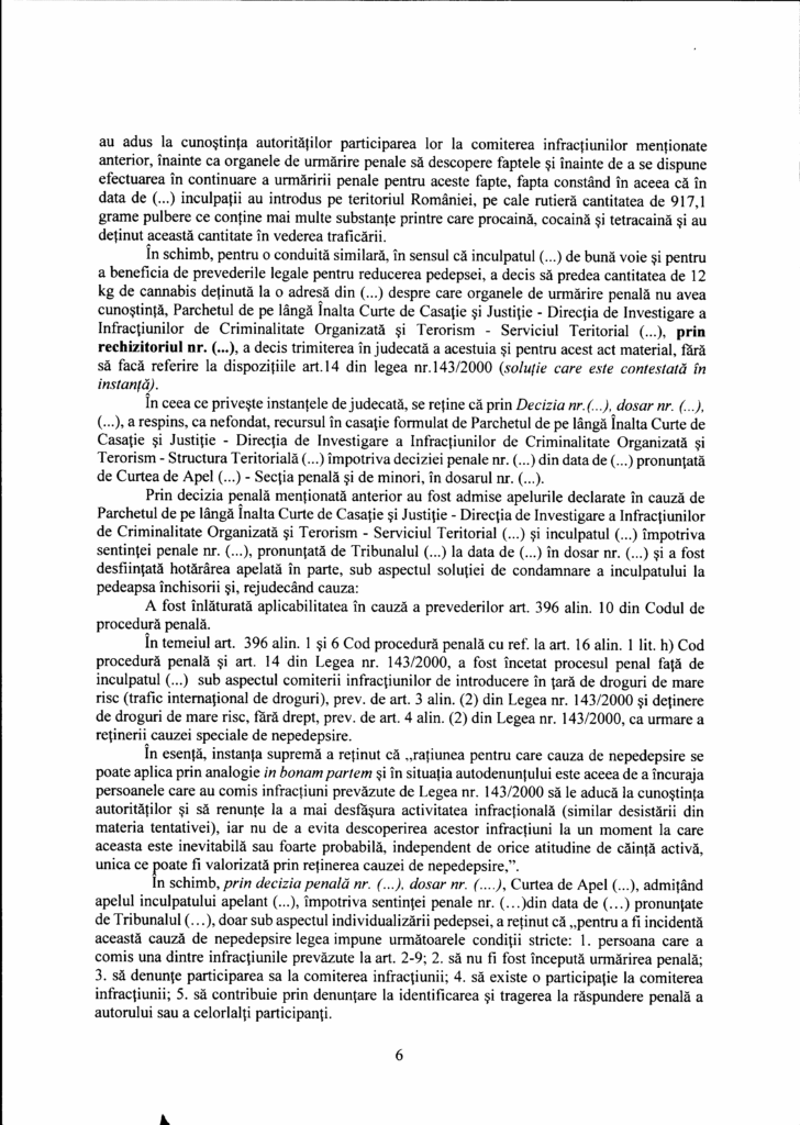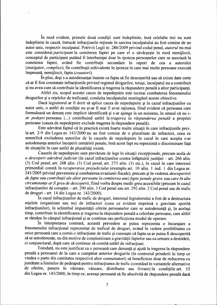 Curtea de Apel a arătat însă că, potrivit jurisprudenței, scopul art. 14 din Legea 143/2000 este destructurarea rețelelor de traficanți, prin încurajarea persoanelor implicate să denunțe și alte persoane participante. În situația unui autor unic, fără alți participanți, această finalitate nu poate fi atinsă, iar aplicarea cauzei de nepedepsire ar echivala cu înlăturarea răspunderii penale proprii.