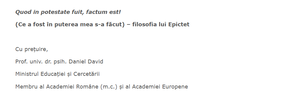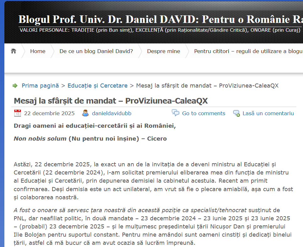 Redăm postarea ministrului demisionar al Educației Daniel David, de pe blogul personal, publicată azi 22 decembrie: