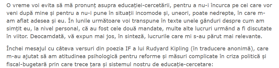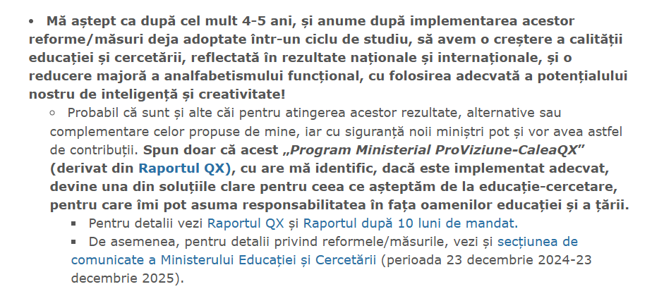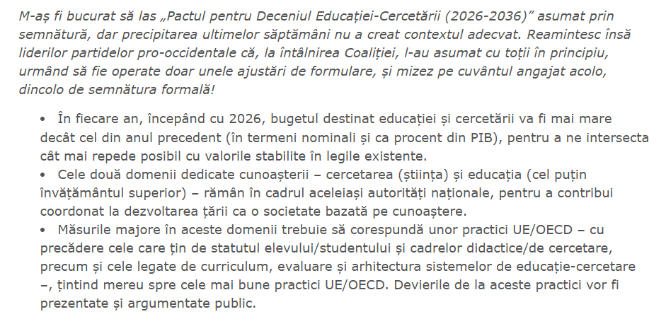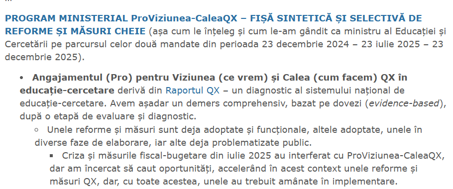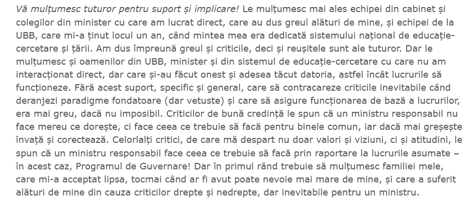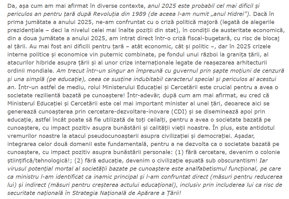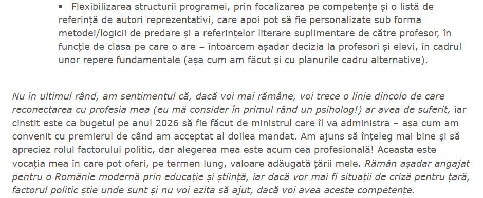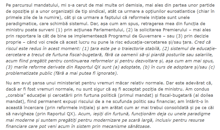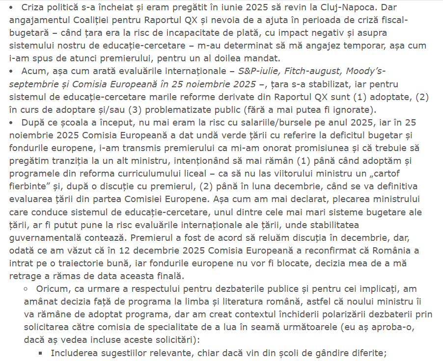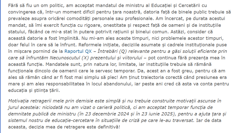 ” Motivația retragerii mele prin demisie este simplă și nu trebuie construite motivații ascunse în jurul acesteia: niciodată nu am vizat o carieră politică, ci am acceptat temporar funcția de demnitate publică de ministru (în 23 decembrie 2024 și în 23 iunie 2025), pentru a ajuta țara și sistemul nostru de educație-cercetare în situațiile de criză pe care le-au traversat. Iar de data aceasta, decizia mea de retragere este definitivă! ”