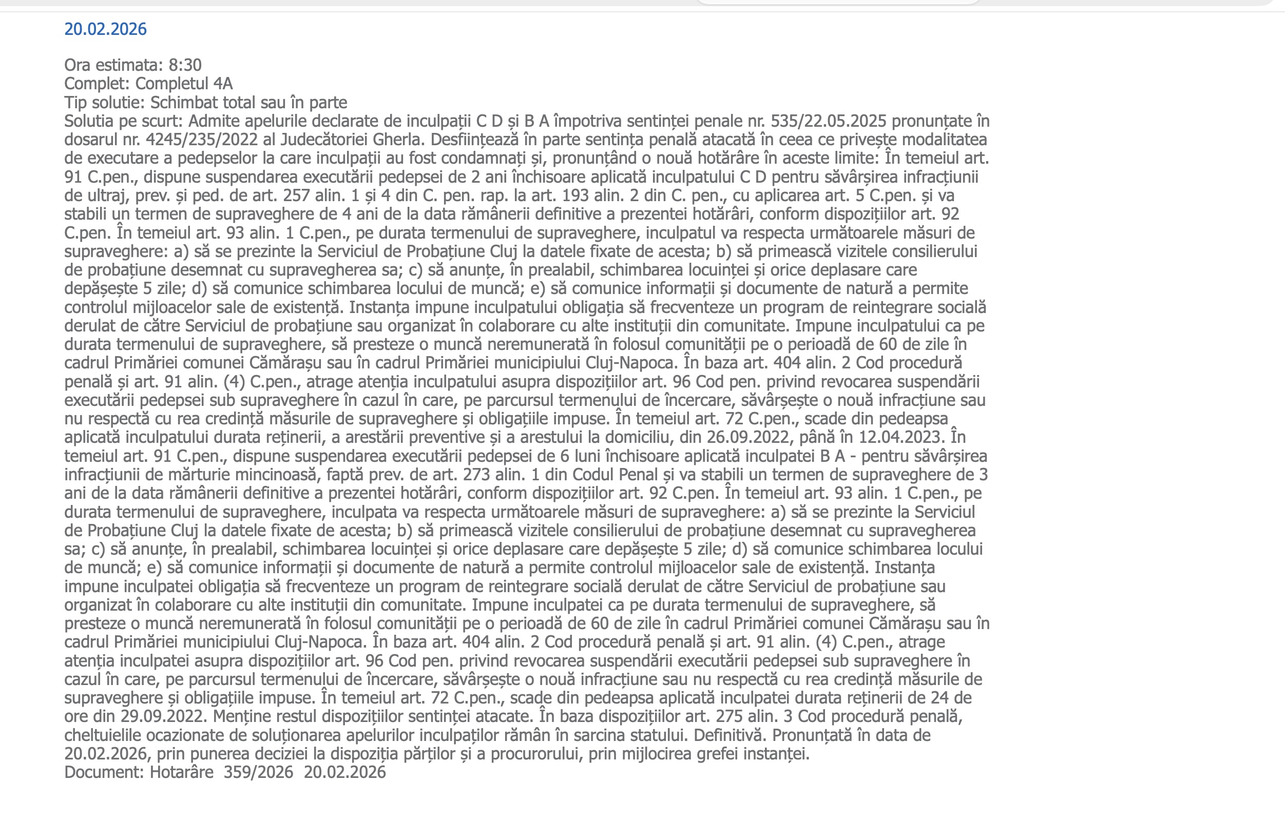 Curtea de Apel Cluj a pronunțat la 20 februarie 2026 o decizie definitivă într-un dosar care a pornit de la o intervenție banală la 112 și s-a transformat într-un caz de ultraj asupra unui polițist, urmat de o acuzație de mărturie mincinoasă. Instanța a confirmat condamnările dispuse în primă instanță, dar a schimbat modul de executare a pedepselor, înlocuind detenția cu suspendarea sub supraveghere, apreciind că scopul sancțiunii poate fi atins și fără încarcerare.