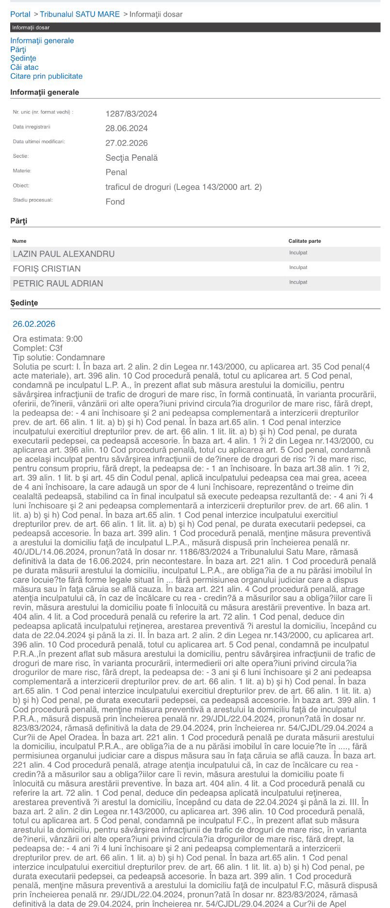 Tribunalul Satu Mare a pronunțat Hotărârea din 26 februarie 2026, într-un dosar instrumentat de DIICOT – Serviciul Teritorial Satu Mare, vizând trafic de droguri de mare risc. Principalul inculpat, cunoscut sub porecla „Vampi”, LAZIN PAUL ALEXANDRU, a fost condamnat la 4 ani și 4 luni de închisoare, în urma unui flagrant cu cocaină.