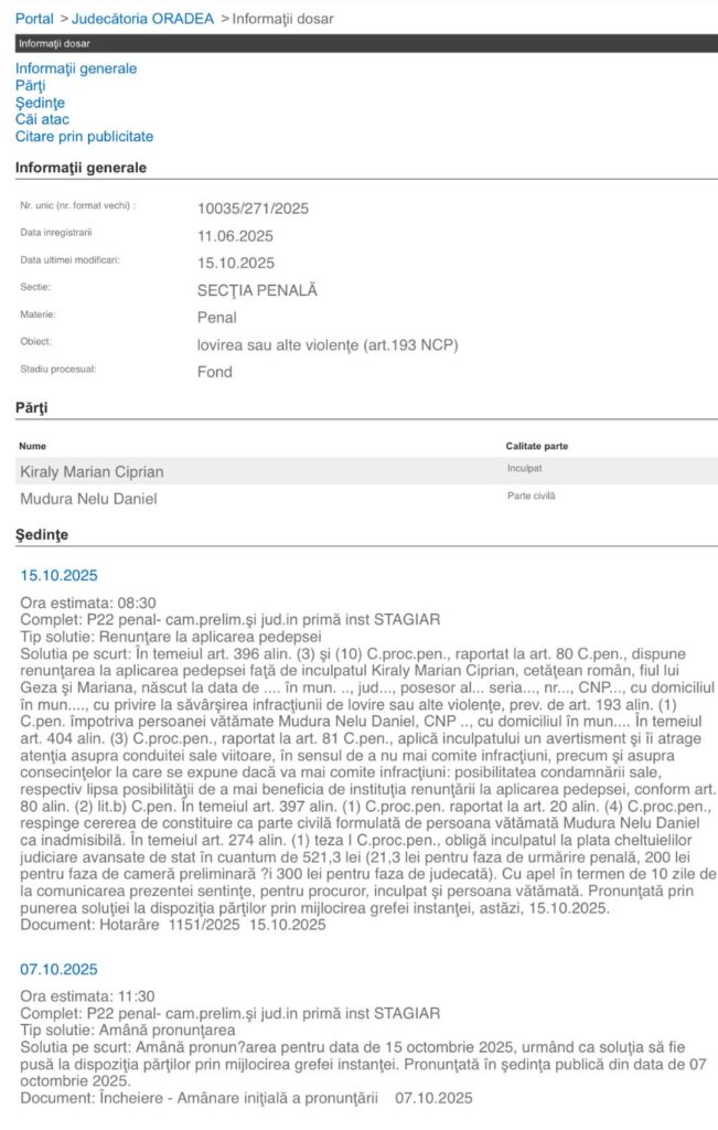 Judecătoria Oradea a pronunțat, la data de 15 octombrie 2025, o sentință prin care a dispus renunțarea la aplicarea pedepsei față de Kiraly Marian Ciprian, un bărbat din Oradea trimis în judecată pentru infracțiunea de lovire sau alte violențe, prevăzută de art. 193 alin. (1) din Codul penal.