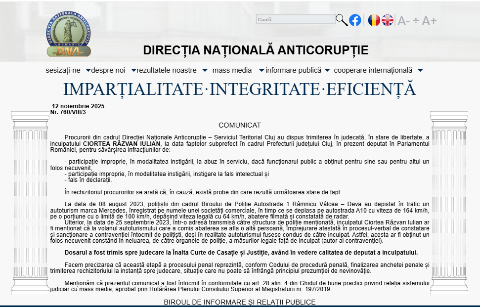 Postăm comunicatul de presă al DNA remis publicității azi, 12 noiembrie: