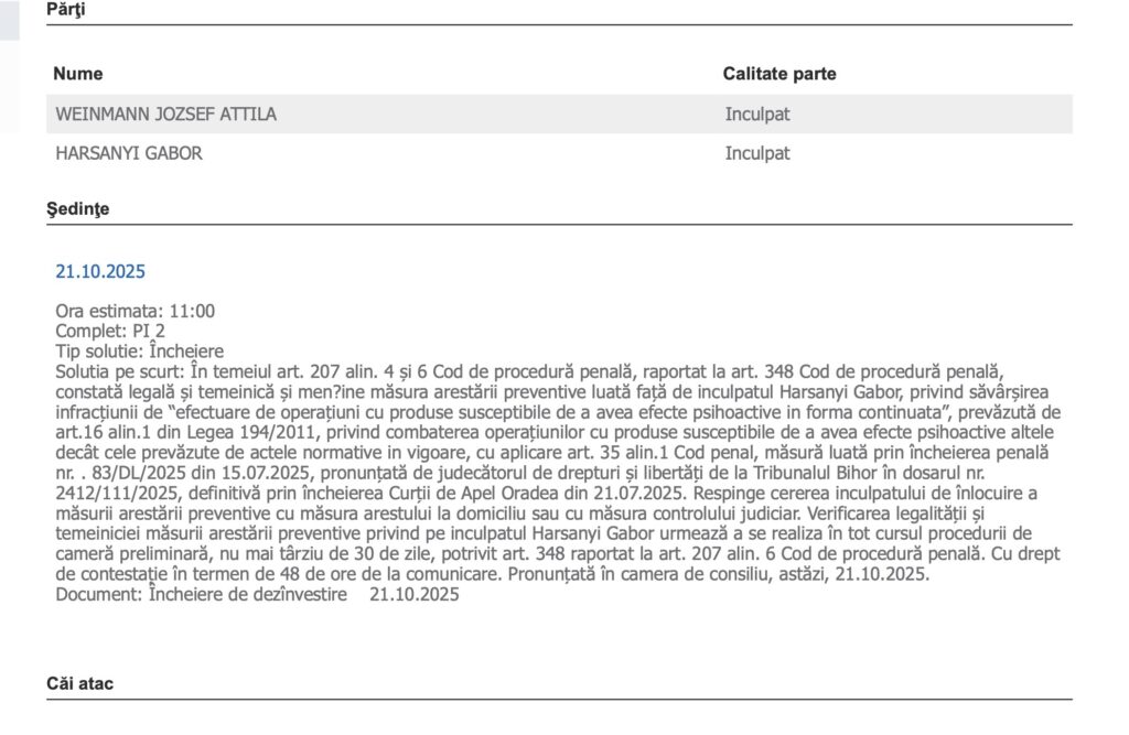 În paralel, Harsanyi Gabor este cercetat pentru efectuarea de operațiuni cu produse susceptibile de a avea efecte psihoactive, faptă încadrată juridic la art. 16 alin. 1 din Legea 194/2011. Pe 14 iulie 2025, acesta a fost prins în flagrant delict, în timp ce vindea 10 grame de 4-BMC pentru 1.400 de lei. În urma perchezițiilor efectuate la domiciliul său, anchetatorii au descoperit alte cantități de substanțe interzise, precum și mijloace de probă relevante pentru dosar.