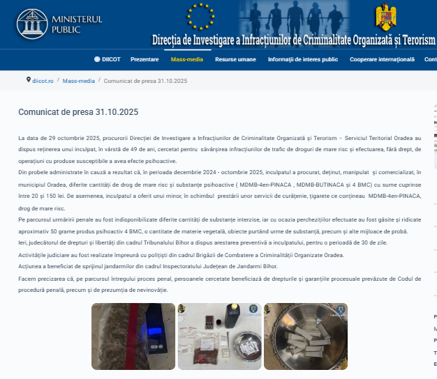 ” La data de 29 octombrie 2025, procurorii Direcției de Investigare a Infracțiunilor de Criminalitate Organizată și Terorism – Serviciul Teritorial Oradea au dispus reținerea unui inculpat, în vârstă de 49 de ani, cercetat pentru  săvârșirea infracțiunilor de trafic de droguri de mare risc și efectuarea, fără drept, de operațiuni cu produse susceptibile a avea efecte psihoactive.