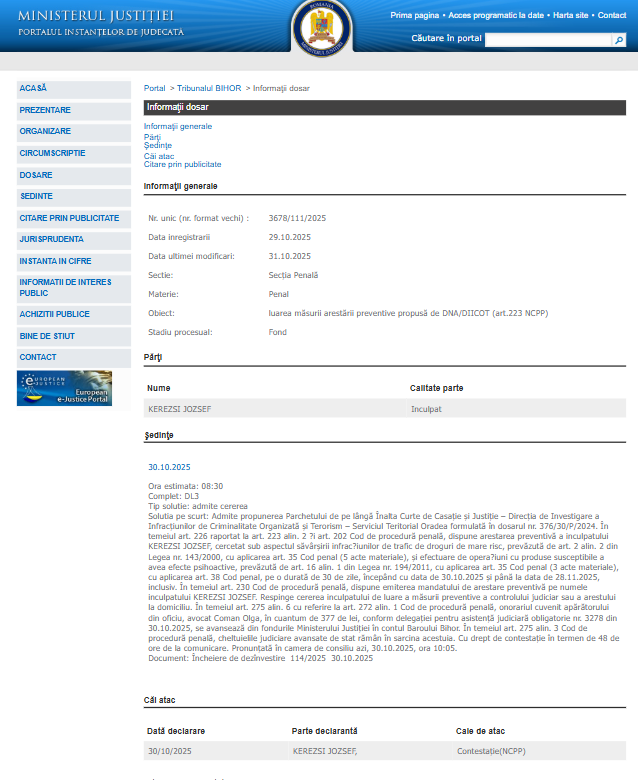 Este vorba de Kerezsi Jozsef, pentru care Instanța a dispus arestarea preventivă, prin Încheierea nr. 114/30.10.2025, și care a formulat contestație împotriva măsurii dispuse.